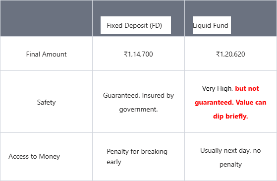 Simple Rule: For money you might need to access quickly (your emergency fund), a Liquid Fund is often the smarter choice because of better returns and easy access. For money you are sure you won’t touch for the full FD term, an FD is simpler and guaranteed.